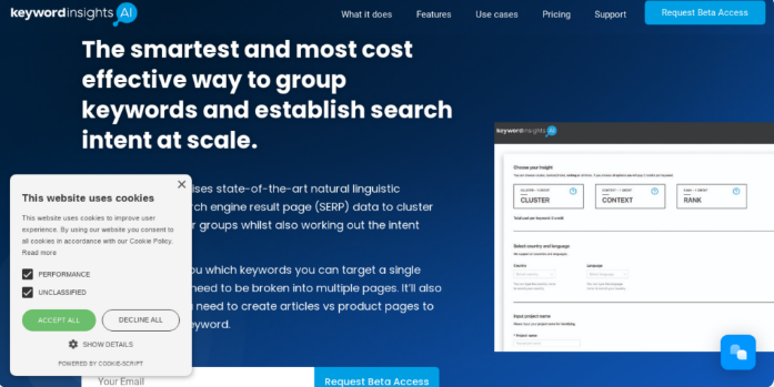 Keyword Insights is the go-to clustering tool for professional SEOs handling large volumes of keywords. It checks live SERP data and groups keywords that share 30% or more of the same ranking URLs — a threshold you can adjust. It handles up to 200,000 keywords in a single run.