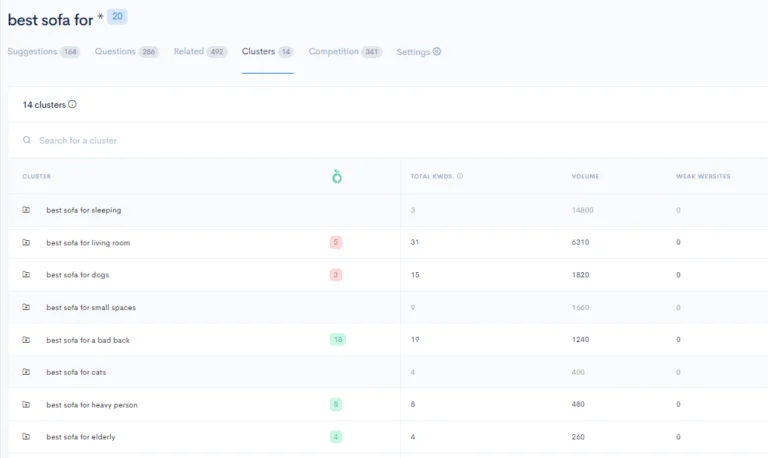 LowFruits combines keyword discovery with SERP-based clustering and adds one standout feature: it shows the domain authority of the weakest competitor ranking in each cluster. This lets you prioritize the clusters where you have the best chance of ranking.
